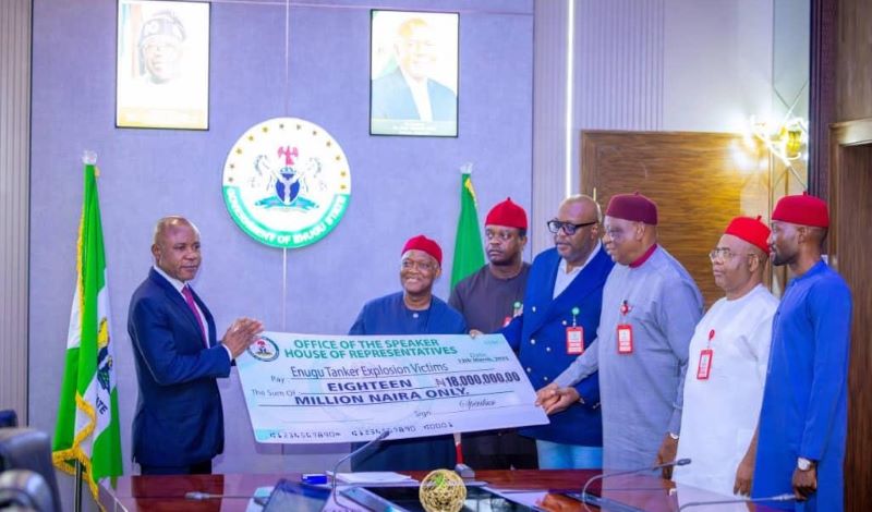 The Speaker, House of Representatives, Hon. Tajudeen Abbas, Tuesday, presented a cheque for N18 million to the Enugu State Government as support to the victims of the January 25 petrol tanker explosion at Ugwu Onyeama on the Enugu-Onitsha Expressway, which claimed several lives.