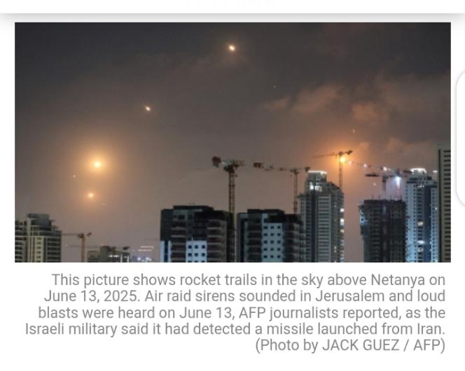 Pic 1: Fire and smoke rise from a building, reportedly hit by a missile fired from Iran, in central Tel Aviv on June 13, 2025. (Photo by Jack GUEZ / AFP)
