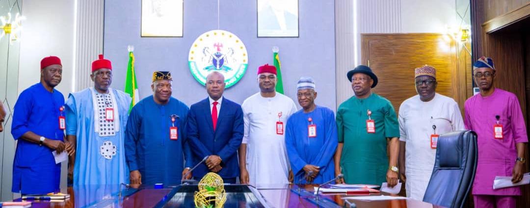 L-R: Governor Peter Mbah (4th) and Senator Sampson (3rd) with other members of the Senate Committee on Solid Minerals Development during the visit to the Government House, Enugu