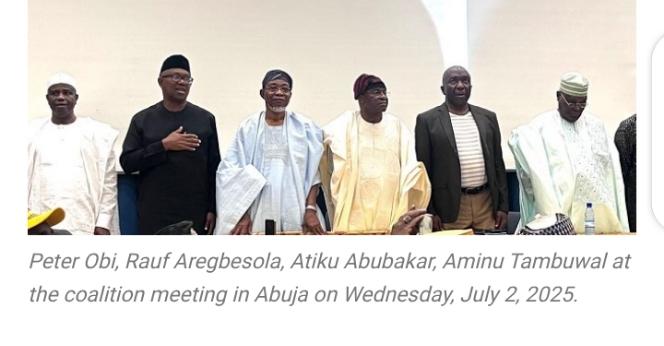 She explained that the party had given its blessings to Obi to participate in the coalition talks. Peter Obi, Rauf Aregbesola, Atiku Abubakar, Aminu Tambuwal at the coalition meeting in Abuja on Wednesday, July 2, 2025.