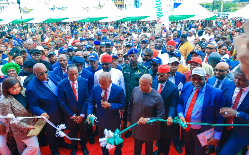 Governor Peter Mbah (middle) cutting the tape during the inauguration of the Holy Ghost Bus Terminal