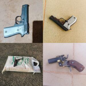 A locally fabricated pistol, also Beretta-like without a magazine or ammunition, and a small bag of rice were recovered. Preliminary investigations reveal that the suspects, together with their fleeing accomplice, had boarded the victim’s tricycle from New Market, Enugu, along with the bag of rice, to the scene where they robbed him.
