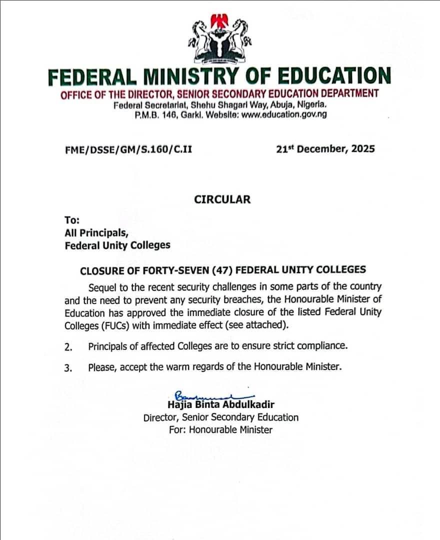 The Nigerian Federal Government has ordered the immediate shutdown of 41 Federal Unity Colleges across several states due to rising security threats.