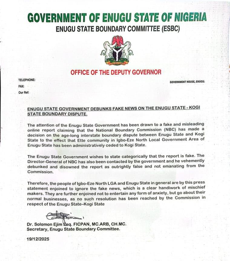 The Enugu State Government has strongly debunked a fake report, which claimed that the National Boundary Commission (NBC) had ceded to Kogi State, Ette, a border community in the Igbo-Eze North Local Government Area of Enugu.