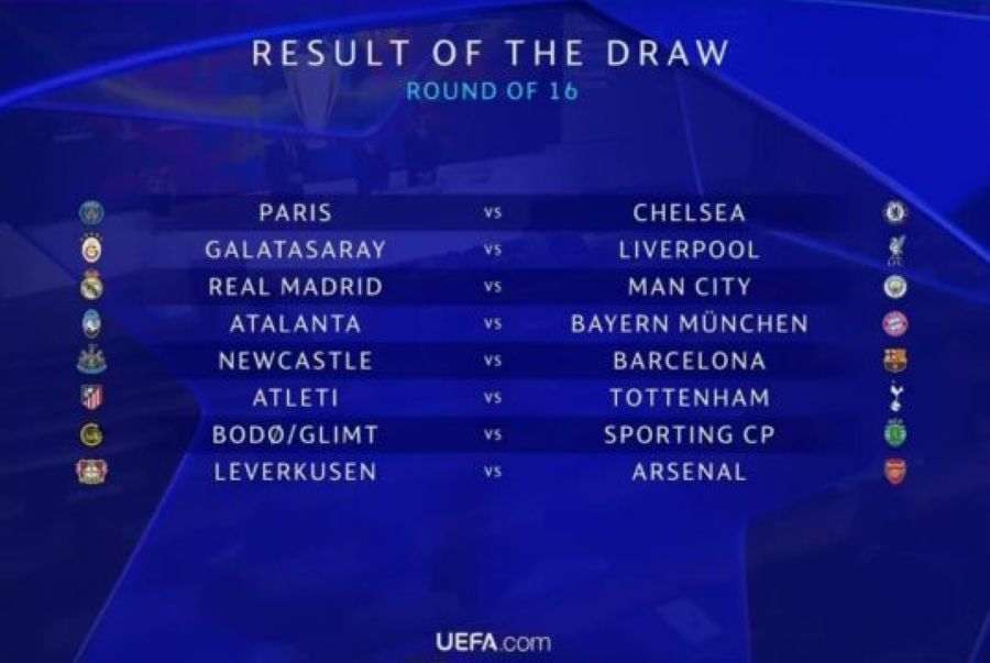 Newcastle United will face Barcelona while Liverpool takes on Galatasaray. Premier League strugglers Tottenham Hotspur face Atletico Madrid while Norwegian upstarts Bodo/Glimt – who beat City, Atletico, and Inter Milan this season – take on Portuguese side Sporting.